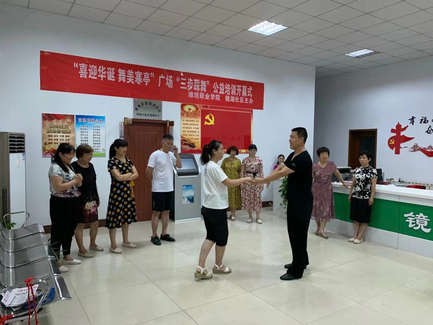 通识教育中心党支部等与寒亭街道镜湖社区开展"喜迎华诞 舞美寒亭“广场健身“三步踩舞“公益培训活动