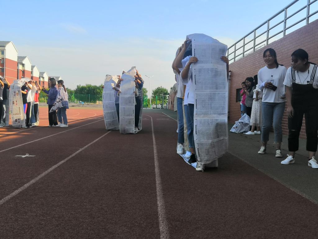 活动共设有“无敌风火轮”和“疯狂的猜想”两个项目,各项活动均以小组形式进行,同学们通过集体活动减轻对手机的依赖并增强团队意识和竞技精神。“无敌风火轮”项目七人一组,每组队员站在利用报纸和胶带制作的封闭式大圆环内,边走边滚动大圆环,在圆环前进的过程中培养了同学之间的凝聚力,而“疯狂的猜想”则由小组派一个代表利用肢体语言描述指定的成语,剩余队员进行回答,不仅丰富了知识储备又增加了彼此之间的默契。通过活动,同学们意识到应该放下手机,学会和同学、家人交流,走向户外,增加运动。