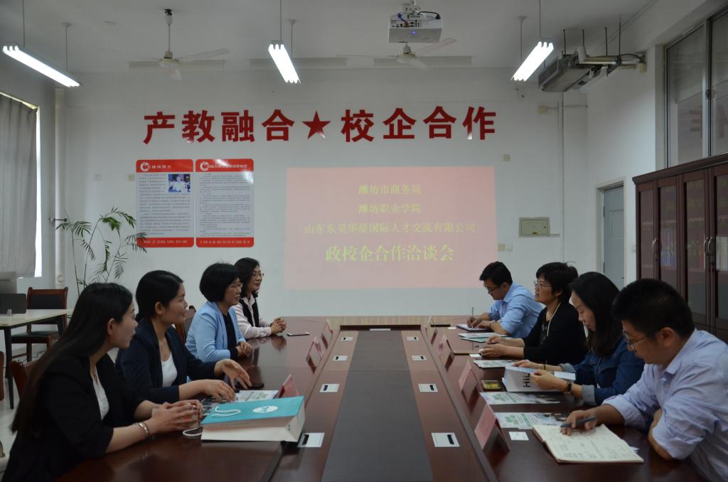 5月14日,潍坊市商务局与山东东昊华晨国际人才交流有限公司赴经营管理学院洽谈学生海外实习就业有关事宜,经营管理学院主要负责同志和产学合作负责同志进行了接待。