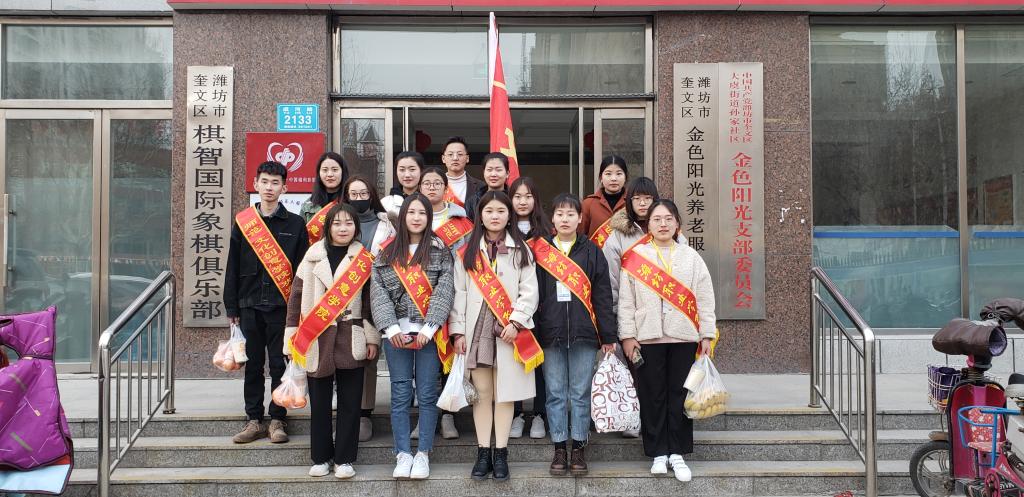 为进一步弘扬雷锋精神,传承敬老爱老的美德,践行“奉献、友爱、互助、进步”的志愿服务理念,3月4日下午,文化创意学院志愿者团队走进潍坊市金色阳光养老服务中心开展敬老爱老活动,为老人们送去温暖和祝福。