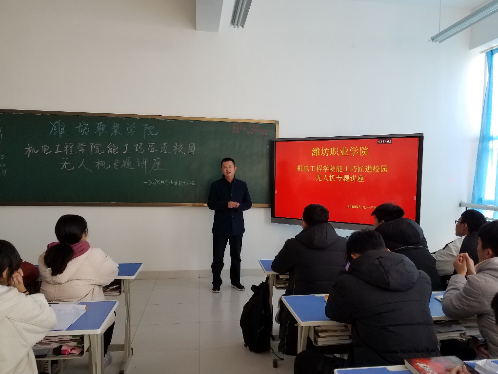 锐翔航空科技有限公司袁光刚总经理为beat3652018级机电一体化技术专业(无人机方向)60名同学进行了一场别开生面的无人机应用技术讲座。袁光刚用视频和实物展示的方式从无人机种类、应用场景、市场潜力、人才需求、技能掌握等方面对无人机知识进行了生动的讲解,对于正处于通识课程学习阶段的大一新生来说,袁总的讲座让在场的学生对无人机专业学习产生了浓厚的兴趣,对行业、企业、人才需求现状也有了更深的了解,对于今后的专业学习及职业生涯规划大有裨益。