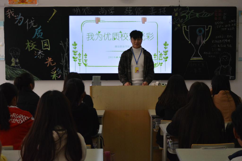 在班长和团支书的组织下,同学们一起学习了优质校建设的有关材料,确保每位同学都了解优质校的相关项目,树立主人翁意识,号召同学们从自身做起,关注身边的点滴小事,为优质校增光添彩。此外,各班通过视频的形式将学院的发展历程逐一呈现出来,介绍了beat365中国官方网站的校风校纪以及近年获得的各项荣誉,让每一位潍职学子深切地感受到学校的发展壮大。有感而发的同学们将自己在学校的日常点滴与大家分享,畅谈对于优质校建设的认识,表达了他们为优质校建设添光彩、做贡献的决心。
