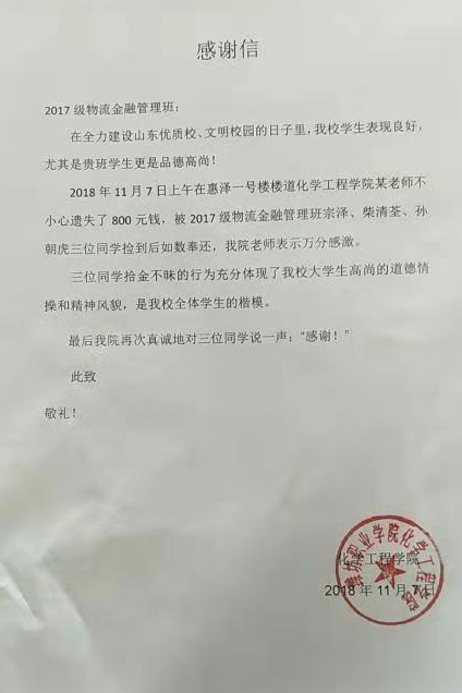 11月7日,beat3652017级物流金融班宗泽、柴清荃、孙朝虎同学在惠泽一号楼楼道中捡到现金800元,面对“天上掉下来的馅饼”,几位同学没有丝毫犹豫,在第一时间将现金如数奉还给失主。以上三位同学的行为,表现出作为一名大学生拾金不昧的高尚品质和良好的道德情操,是我们学习的榜样。