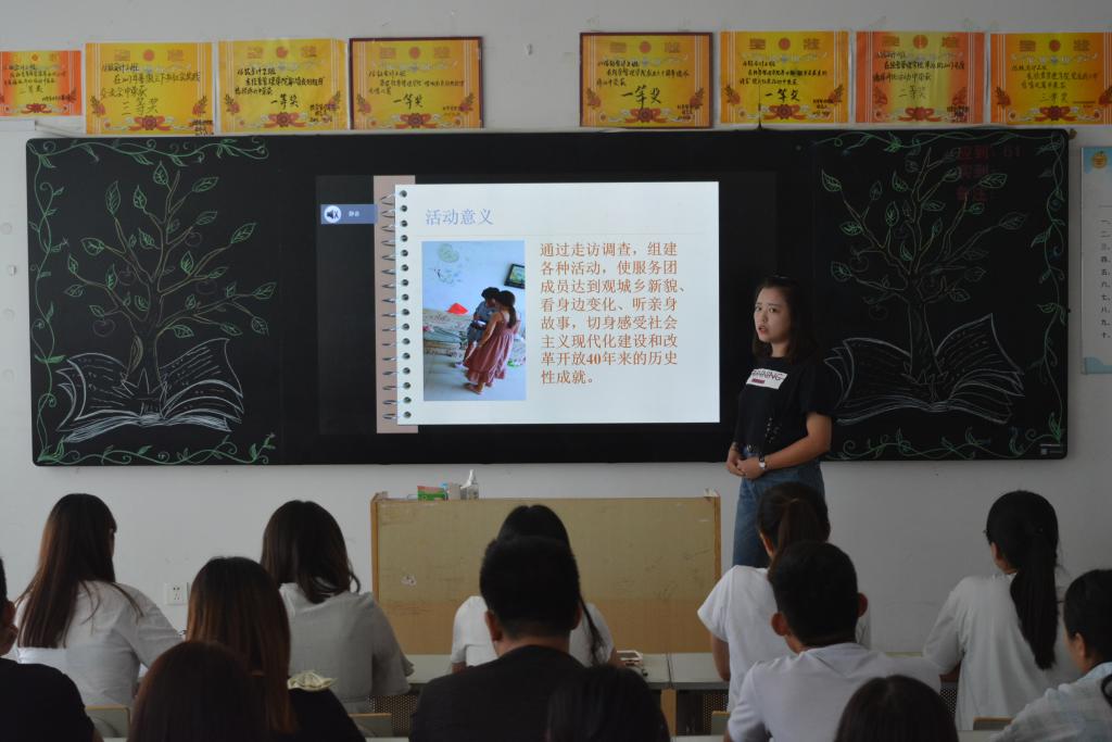 各班团支书根据同学们的参与情况与实践成果以PPT的展示形式进行了汇报,在汇报中相互分享社会实践中的体验及收获,抒发自己对暑期社会实践的感悟。