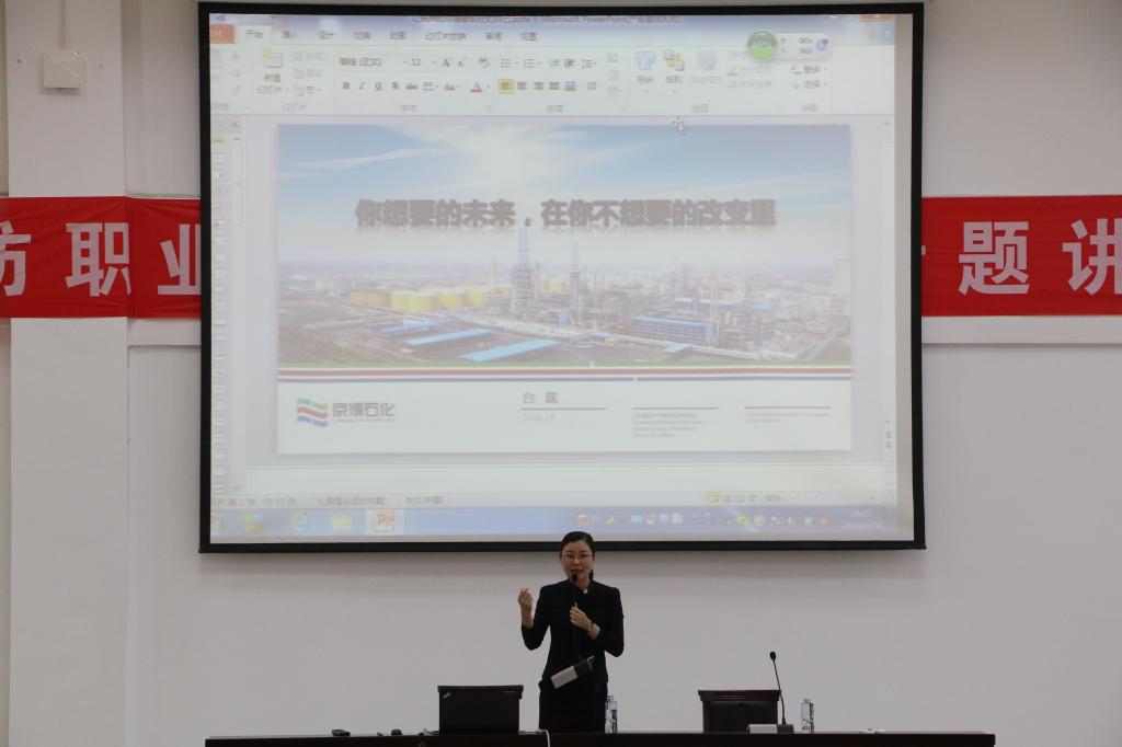 台磊介绍了山东京博石油化工有限公司基本情况,从“告别过去 迈向未来”、“规划自己 经营人生”、“脚踏实地 仰望星空”三个方面诠释当代大学生过渡到职场人的心态转变。并从新旧动能转换背景下新时代的有为青年,要提层次、强实力、转变心态,规划人生,只要抓住机遇,敢于迎接挑战等方面对同学们提出了希望和建议。