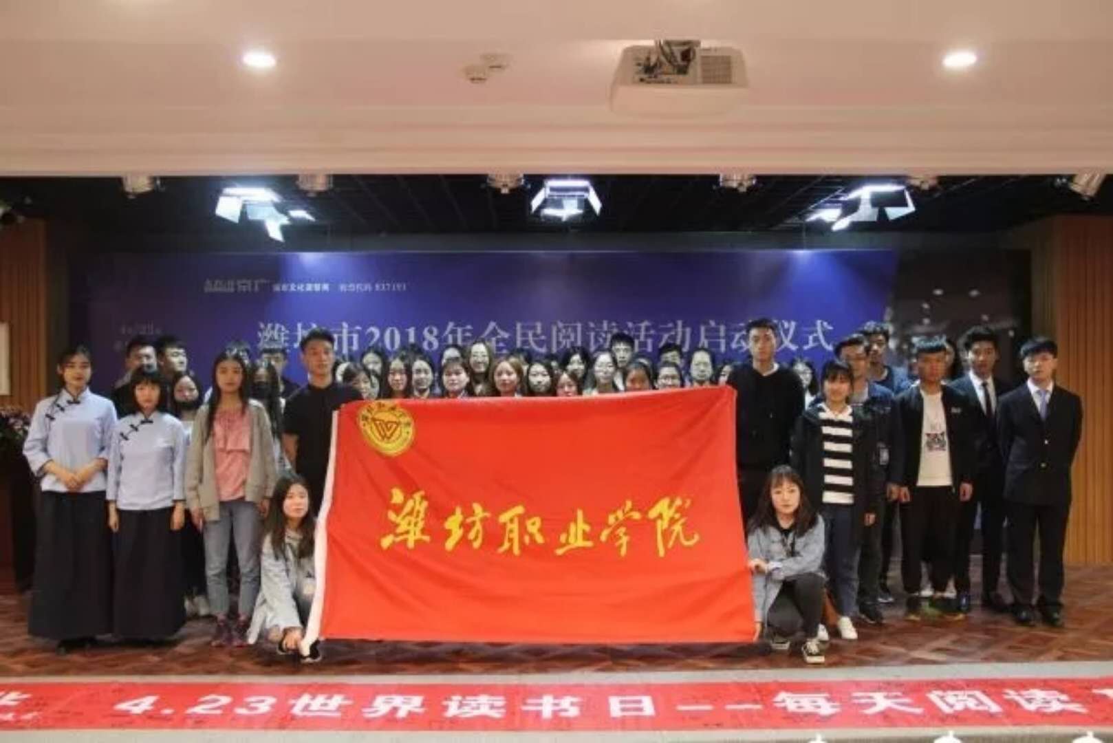 为贯彻落实关于建设学习型社会要求,推进潍坊市“全民阅读”活动深入开展,提高学生的文明素质。4月22日上午,文化创意学院100余名学生前往潍州大讲堂参加潍坊市“京广读运会·千人诵读”活动。