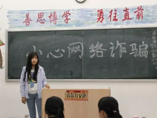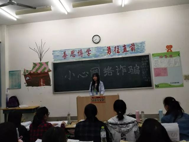 为让同学们深刻地认识到目前电信诈骗的基本情况,各班以视频的形式为同学们展现了《反点心网络诈骗》宣传片,生动讲解了专门针对高校学生的电信诈骗手段:网络兼职刷单诈骗、冒充淘宝客服诈骗、网络贷款业诈骗、利用QQ和微信冒充熟人诈骗、中奖诈骗等诈骗手段。同学们认真学习并讨论了防范网络诈骗的对策,如转账前通过电话等方式核实,网上不轻信陌生人,使用安全的支付工具,被骗后及时报警等。