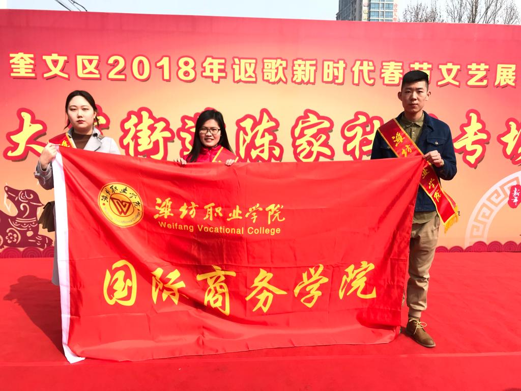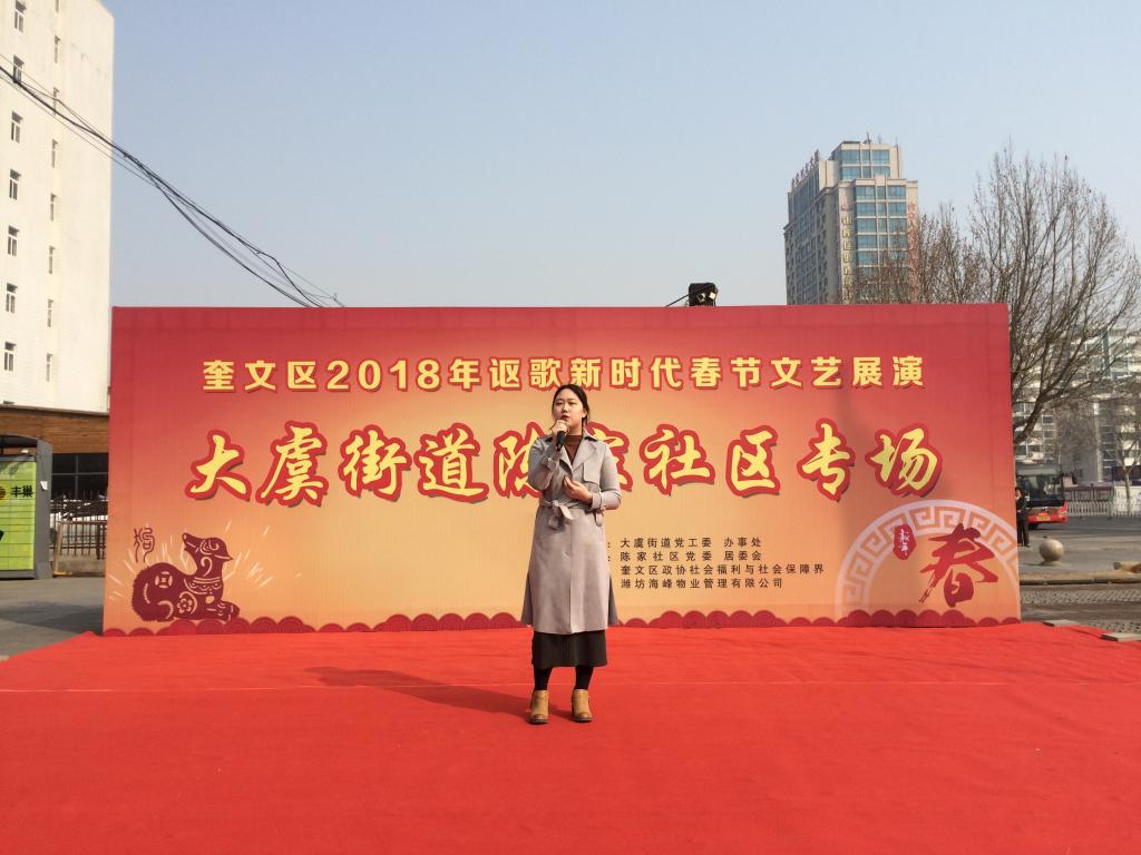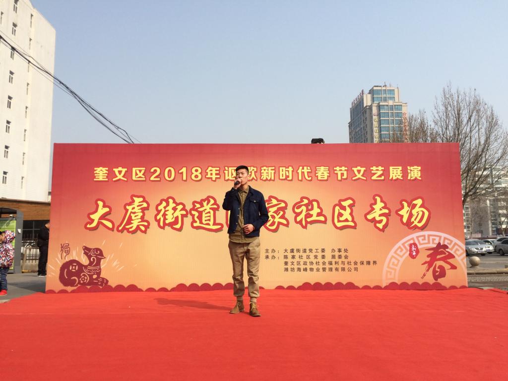 3月10日下午,beat365学生志愿者参与大虞街道陈家社区举行2018年讴歌新时代春节文艺展演,此次展演由大虞街道党工委、办事处主办,由陈家社区党委、居委会、奎文区政协社会福利与社会保障界承办。演出在百姓观众的热烈掌声中开始,beat365学生一首《时间都去哪了》,嗓音优美、情感充沛,台下观众为之动容;一曲《Call me maybe》,动感欢快,赢得了观众的掌声和欢呼;更有社区成员们精心编排的舞蹈《正月里来闹新春》、汉族舞《烟花三月》、《红梅花又开》,京剧《智取威虎山》将中华优秀传统文化尽数展现。演出现场,掌声不断,虽然冬天的凉意还没有消退,但演出舞台热闹非凡,演员们表演情绪高涨,点燃了观众的热情,演出得到了老百姓们的一致好评。