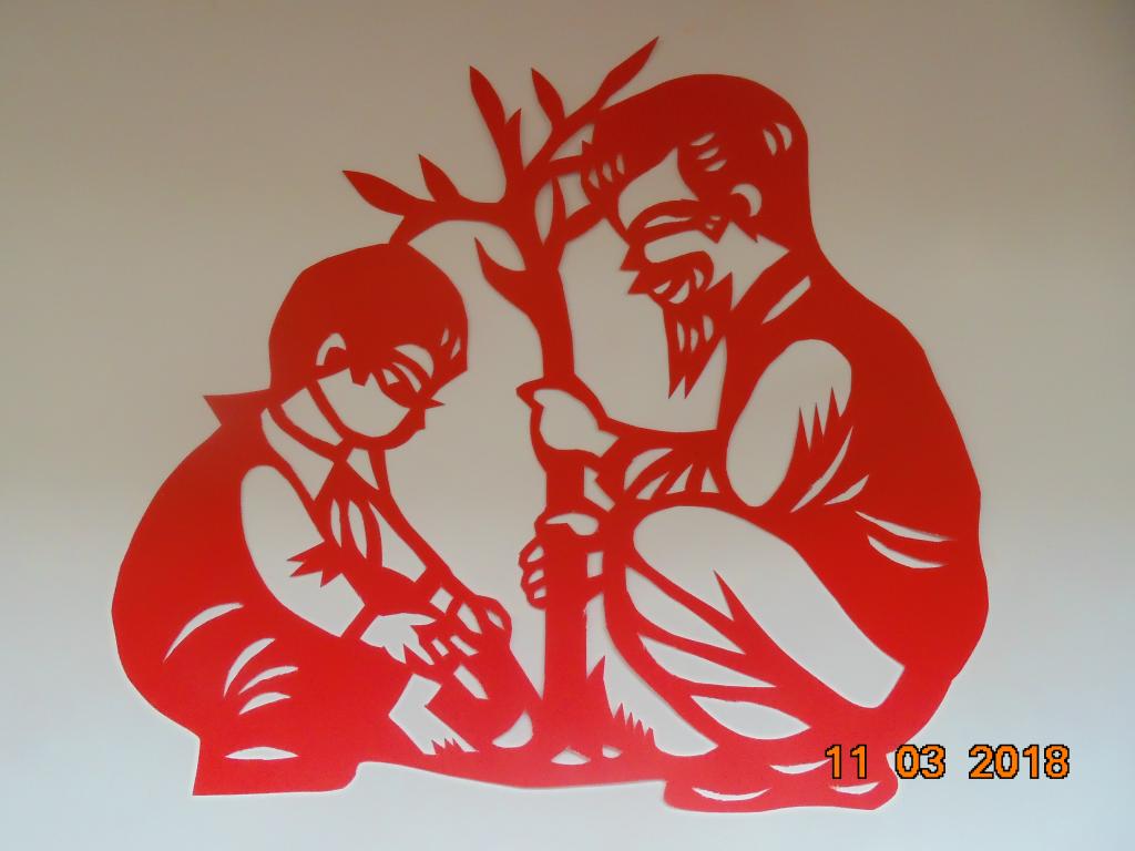 在剪纸教师的指导下,同学们以剪纸知识为基础,精心刻画剪纸图形,积极进行剪纸创作。一把剪刀,一张红纸,在同学们的手中不停地舞动,一幅幅精美的作品便展现在我们面前:茁壮成长的树苗,活灵活现的小鸟,惟妙惟肖的人物,跃然在纸上。学生将传统剪纸艺术活动与时代要求相结合,主动以创新的形式参与到宣传保护树木的活动中去。