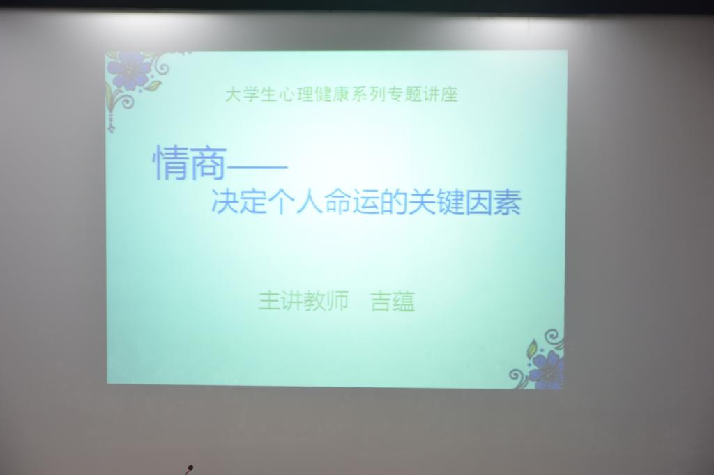 讲座伊始,吉蕴老师通过趣味问答的方式与同学们互动,鼓励同学们发表对“情商”的看法,营造了积极的活动氛围。随后,吉蕴老师围绕“情商”与“成功”两大话题,结合ppt通过相关的研究数据,清晰的向同学们展示了情商与成功的联系。吉蕴老师以幽默诙谐的语言风格援引了现实生活中的案例以及名人故事使大家意识到情商的重要性。最后她就如何提高情商为大家提出了六点建议,引发了同学们的思考。