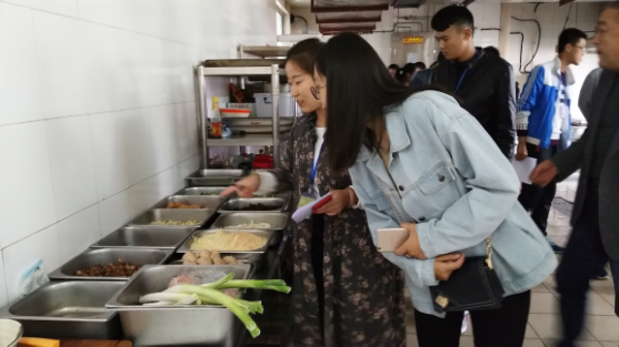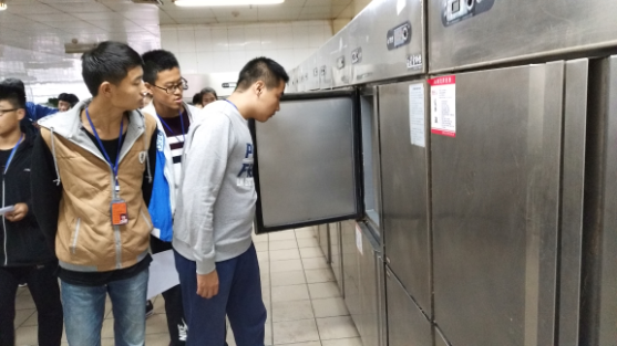 同学们实地参观了餐厅的初加工、备餐间、清洗区、炒做间、留样间、售饭厅、碗筷消毒室及餐厅规章制度和管理机制等各种工作场所及各个流程并进行深入了解。对物品的摆放、环境卫生等进行了细致的检查,亲眼目睹了餐厅师傅的煎炒烹炸,对食品加工制作繁杂而有序的工作有了了解。