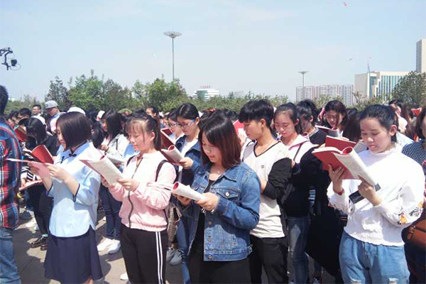 值世界读书日来临之际,4月23日上午,文化创意学院100余名学生到潍坊市人民广场参加了“京广读运会·千人诵读”活动。