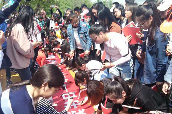 在千人诵读活动中,同学们与来自社会各界的读书爱好者一起,声情并茂吟诵了《声律启蒙》、《大学》、《中庸》、《论语》等经典片段,共同经受经典传统文化的洗礼。此次“读运会”借鉴运动会的理念,在举办过程中增加了读者的参与性、互动性和体验性,让广大青年在争当读运会冠军的过程中体验到读书学习的乐趣,同时倡导人们多读书、读好书,让读书成为一种生活时尚。诵读结束后,同学们逐一走向演讲台,在千人诵读横幅上郑重签字。(王倩供稿)