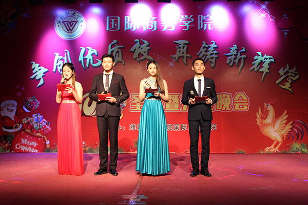 12月22日,国际商务学院“争创优质校•再铸新辉煌”2017圣诞暨元旦晚会在奎文校区报告厅举行。学院副院长贺志强及各部门、二级学院负责同志与国际商务学院全体师生观看了晚会。