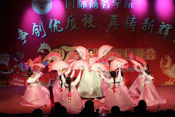 伴着绚丽的灯光和震撼的音乐,开场舞《Shadow ninja》拉开了晚会的帷幕。中、英、韩三语主持人盛装登场宣布晚会正式开始。晚会节目精彩纷呈,有抒情的歌曲串烧《南山南+梦一场》、《偏爱宁静的北京》,有劲爆动感的潮流时尚街舞《bangbangbang》,富有韩国古典风韵的《大长今》,激情澎拜的《IF YOU DO》,优雅动人的歌伴舞《年轮》,幽默诙谐的舞蹈《咋了爸爸》,为观众们带来了一场精彩绝伦的视听盛宴。饶有风趣的相声《我的大学生活》,小品《地铁偶遇》、《甄嬛后传》以夸张的动作,风趣的言语赢得了满堂喝彩。由国际商务学院教师带来的劲舞《Crazy Dance》和手语诗朗诵《隐形的翅膀》节目,展现了老师们活力四射、和蔼可亲的一面,为晚会增添了绚丽的一笔。国际商务学院学生会学生以学院创建优质高职校为目标,结合自己工作的实际,用高昂的士气和坚定的信心,送出以《创优质校•圆潍职梦》为主题的新年寄语:“青春潍职,我们用歌声去舞动;最美潍职,我们用努力去创造;优质潍职,我们用文明去构建;梦想潍职,我们用智慧去谱写;让我们以昂扬的士气,让我们用青春的韶光,共同争创优质高校,圆我潍职梦想。”将晚会推向了高潮。
