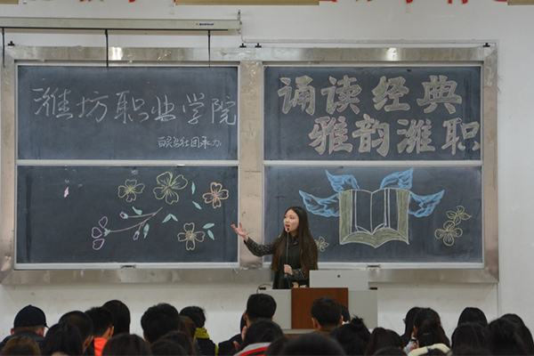 为喜迎beat365中国官方网站六十周年校庆,秉承“明德、尚学、强能、善技”的校训,提升beat365大学生的思想道德素质和文明修养,10月27日,国际商务学院在奎文校区举办主题为“诵读经典,雅韵潍职”的经典诵读比赛。