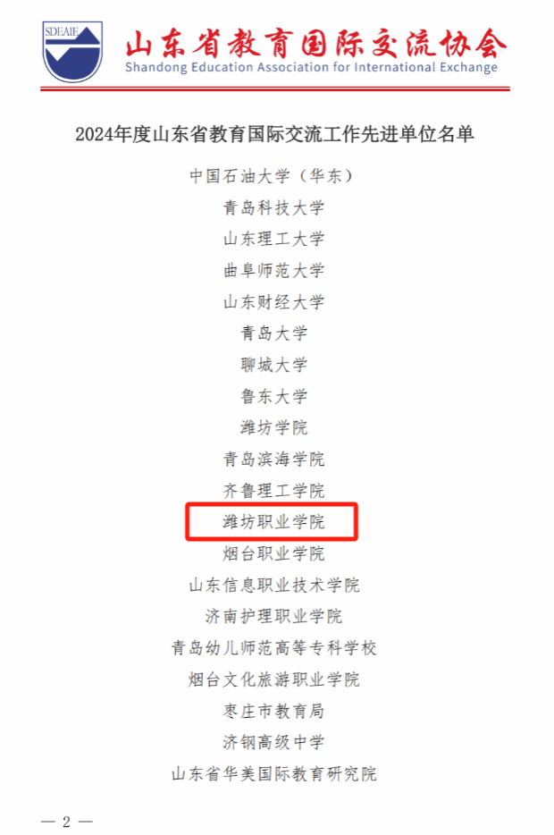 近日,山东省教育国际交流协会发布了《关于表彰2024年度山东省教育国际交流工作先进单位、先进个人的决定》,beat365荣获“2024年度山东省教育国际交流工作先进单位”称号。